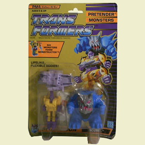 Notes: Never underestimate Hasbro’s willingness to exploit a new concept. Combiners? Hello aerial/ protecto/ techno bots and your decepticon counterparts. Add a robot partner? Here comes target/ head/ powermasters. Pretenders were no different, and thus pretender beasts joined their humanoid pretender counterparts. The shells, like those of Carnivac, were blocks, and would have been really nice with some leg articulation. But still, somehow a rabid wolf seemed a little more appropriate for Earthen combat than scaly monsters.